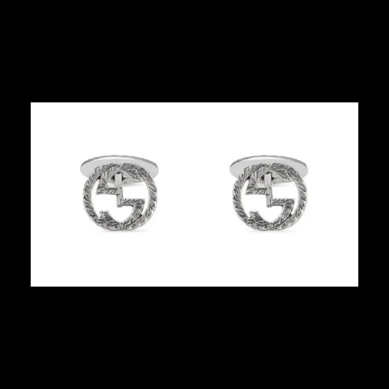 Tra i codici distintivi della Maison riaffiorati dagli archivi degli anni ’70, la Doppia G definisce questi gemelli in argento lavorato. Argento 925