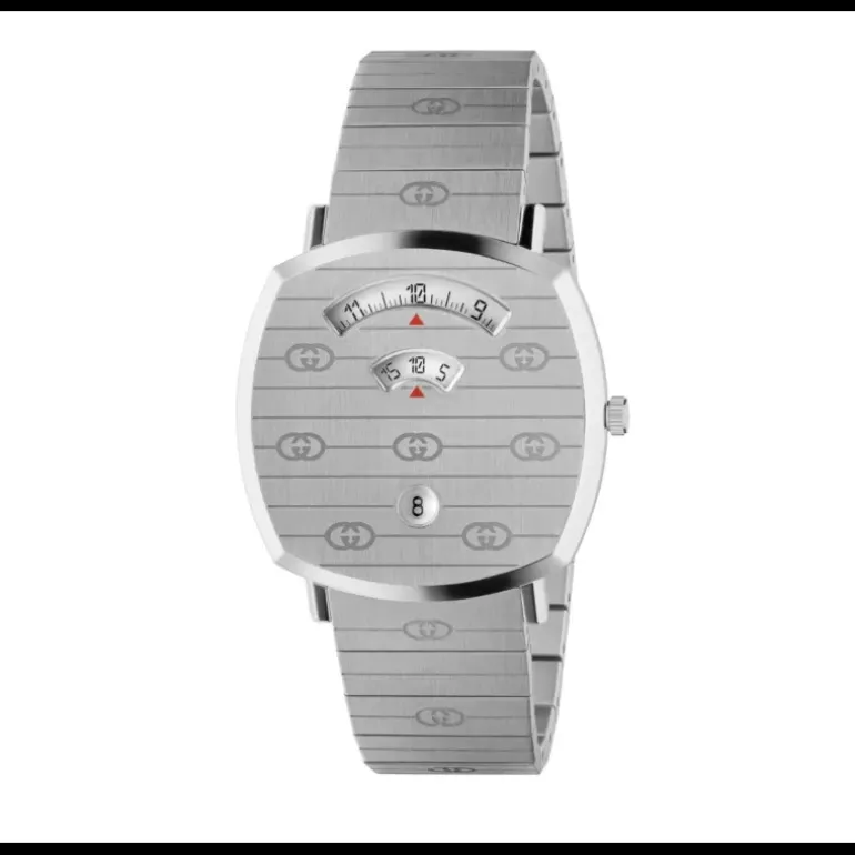Orologio da polso lusso Gucci Grip analogico unisex con movimento al quarzo, cassa in acciaio inossidabile di diametro 38 mm, quadrante multicolore, vetro zaffiro e cinturino in acciaio inossidabile di colore argento.