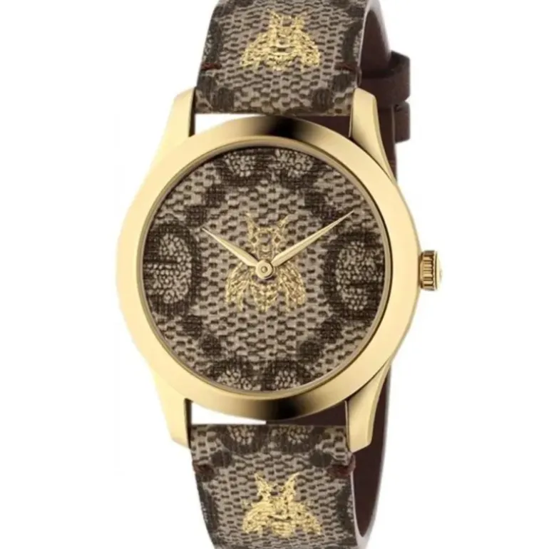 Orologio da donna Gucci della collezione G-Timeless, Movimento al quarzo Swiss Made, Cassa in acciaio placcato oro, Cinturino in pelle con stampe, Vetro zaffiro, Impermeabilità 5 ATM.