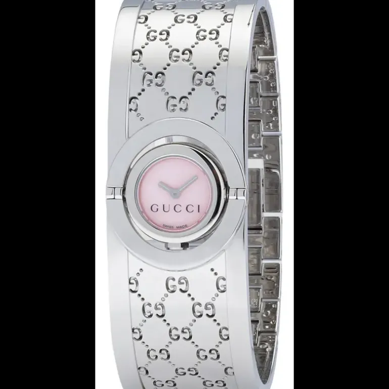 L’orologio Gucci Twirl da donna è dotato di un movimento Swiss Made Ronda al quarzo. La cassa in acciaio presenta il fondello a pressione ed il quadrante in madreperla rosa con vetro zaffiro antigraffioIl bracciale bangle in acciaio è caratterizzato dalla chiusura gioiello. Diametro cassa 16 mm. Resistente all’acqua fino a 30 metri. Tipo di quadrante: Analogico. Funzione: ore, minuti.