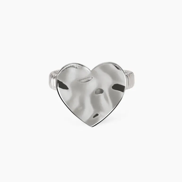 Anello con elemento a forma di cuore effetto martellato. • Dimensioni anello tubogas: 4 x 2 mm • Dimensioni cuore: 17 x 16 mm • Materiale: Acciaio 316L, Acciaio 304