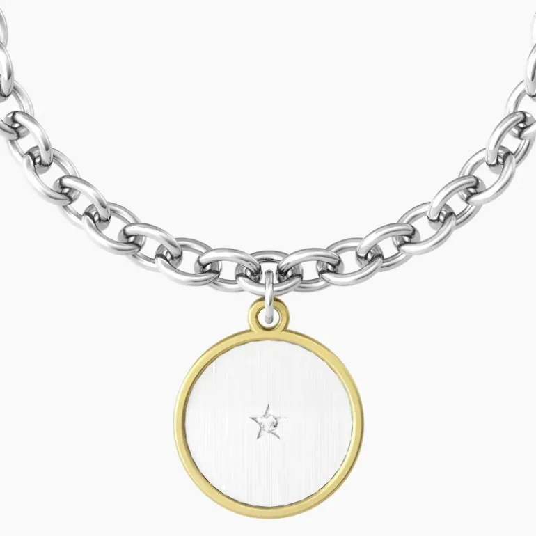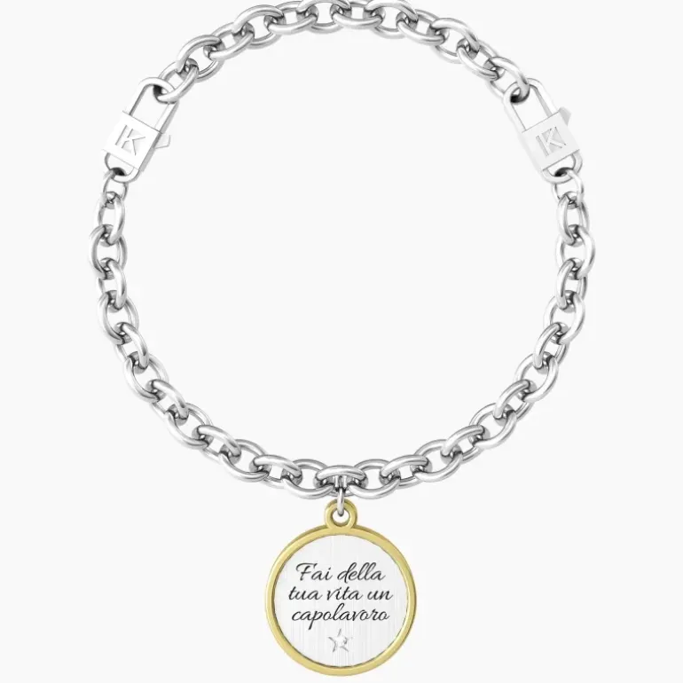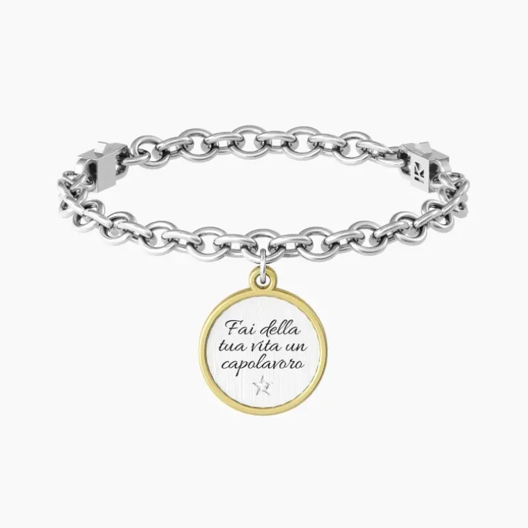 Bracciale con catena rolo’, misura regolabile grazie al sistema “comfort fit”. Ciondolo tondo in acciaio satinato con rifinitura a contrasto color oro. Incisione smaltata con frase motivazionale “Fai della tua vita un capolavoro” e punto luce sul fronte e sul retro. Il sistema “comfort fit” permette facilmente di adattare in modo confortevole ed elegante il bracciale al tuo polso. Scegli la lunghezza della catena più adatta al tuo polso, agganciala ai due moschettoni e indossa il bracciale. • Dimensione del ciondolo: 18 mm • Diametro dei cristalli: 1.5 mm • Dimensione maglia catena: 5 mm • Chiusura con moschettoni e adattamento “comfort fit” • Misura Small, lunghezza 16 cm; misura Medium, lunghezza 17,5 cm; misura Large, lunghezza 19 cm • Materiale: Acciaio 316L con Pvd Oro, Cristallo