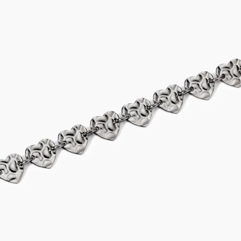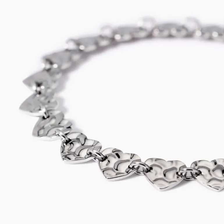 Bracciale regolabile con elementi a forma di cuore effetto martellato. • Dimensione elementi martellati: 8 x 7,5 cm • Misura regolabile, lunghezza da 16 a 19 cm • Materiale: Acciaio 316L