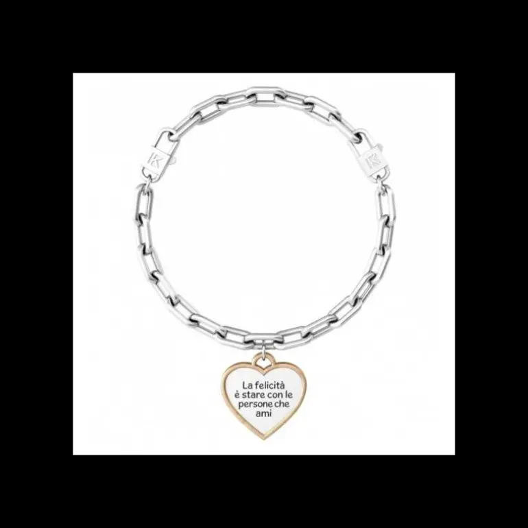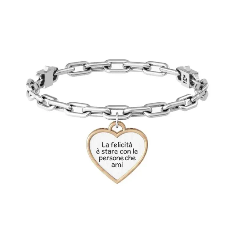 La felicità è stare con le persone che ami Bracciale in acciaio con catena a maglie ovali “comfort fit” e ciondolo satinato a cuore con rifinitura color oro giallo e cristallo. • Il sistema “comfort fit” permette facilmente di adattare in modo confortevole ed elegante il bracciale al tuo polso. Scegli la lunghezza della catena più adatta al tuo polso, agganciala ai due moschettoni e indossa il bracciale. • Incisione smaltata sul ciondolo e cristallo sul retro • Dimensione del cuore: 19,4 x 19,9 mm • Diametro del cristallo: 1,5 mm • Dimensione della catena: 9,5 x 5 mm • Chiusura con moschettoni e adattamento “comfort fit” • Misura Small, lunghezza 16 cm; misura Medium, lunghezza 17,5 cm; misura Large, lunghezza 19 cm • Materiale: Acciaio 316L con Pvd Oro, Cristallo