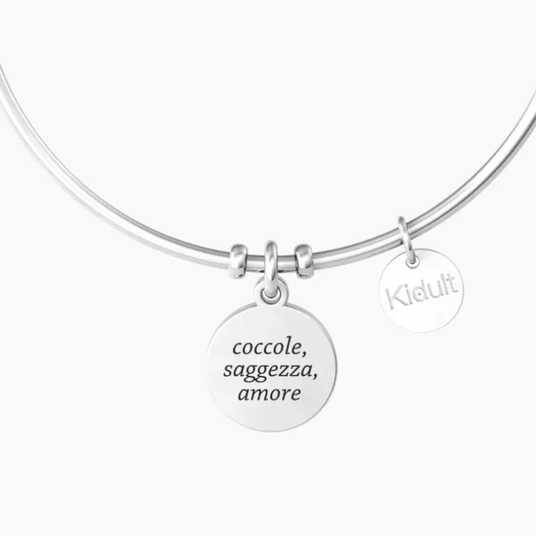 Bracciale bangle Nonna in acciaio con ciondolo tondo satinato con cristallo bianco e scritta “Grazie nonna…coccole, saggezza, amore”. • Dimensione del ciondolo: 15 mm • Diametro del cristallo: 1.5 mm • Misura unica, circonferenza 20 cm • Materiale: Acciaio 316L, Cristallo