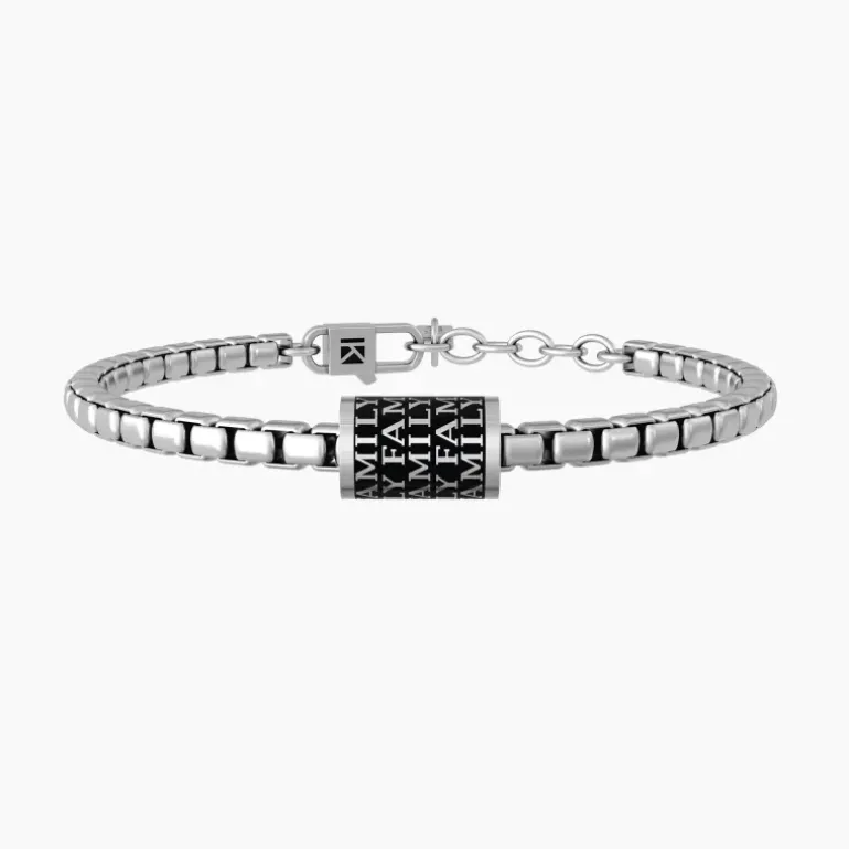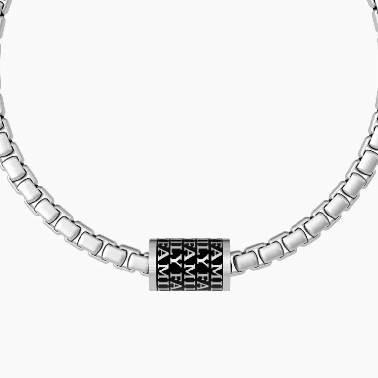 Bracciale in acciaio con catena veneta satinata e inserto nero con scritta “Family”. • Misura regolabile, lunghezza da 19 a 21 cm • Larghezza della maglia: 4 mm • Dimensioni inserto: 13×8.5 mm • Materiali: Acciaio 316L con PVD nero