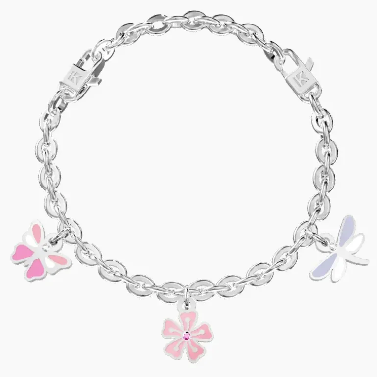 Bracciale regolabile Comfort Fit in acciaio con catena forzatina, ciondoli smaltati a forma di farfalla, fiore e libellule, con cristalli rosa e bianchi. • Il sistema “comfort fit” permette facilmente di adattare in modo confortevole ed elegante il bracciale al tuo polso. Scegli la lunghezza della catena più adatta al tuo polso, agganciala ai due moschettoni e indossa il bracciale. • Dimensione della farfalla: 11.5 x 10.5 mm • Dimensione del fiore: 10 x 12.5 mm • Dimensione della libellula: 15 x 11 mm • Diametro dei cristalli: 1.5 mm • Chiusura con moschettoni e adattamento “comfort fit” • Misura Small, lunghezza 16 cm; misura Medium, lunghezza 17,5 cm; misura Large, lunghezza 19 cm • Materiale: Acciaio 316L, Smalto, Cristalli