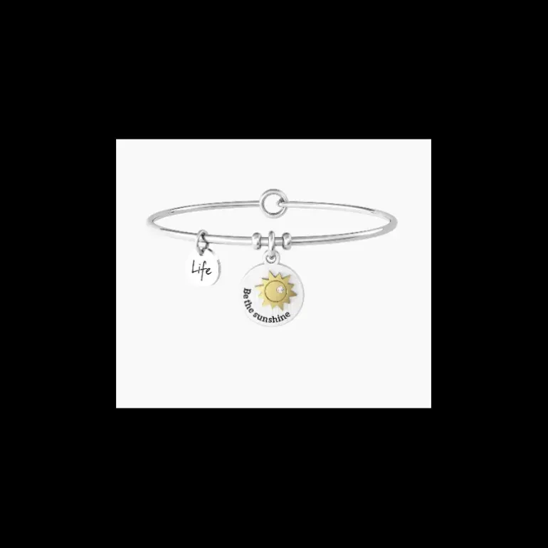Descrizione prodotto Bangle in acciaio con ciondolo tondo satinato con sole dorato lucido, cristallo e scritta “Be the sunshine”. • Misura unica, diametro 20 cm • Diametro del ciondolo tondo grande: 6 cm • Dimensioni del ciondolo tondo piccolo: 15 mm • Chiusura tonda • Materiali: Acciaio 316L con PVD oro lucido, Cristallo