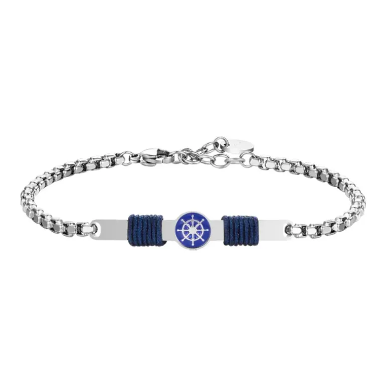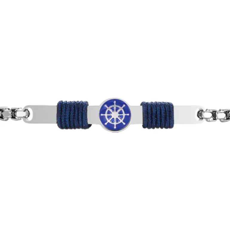Luca Barra – BRACCIALE IN ACCIAIO, PIASTRA CON SMALTO BLU E TIMONE E CORDA BLU