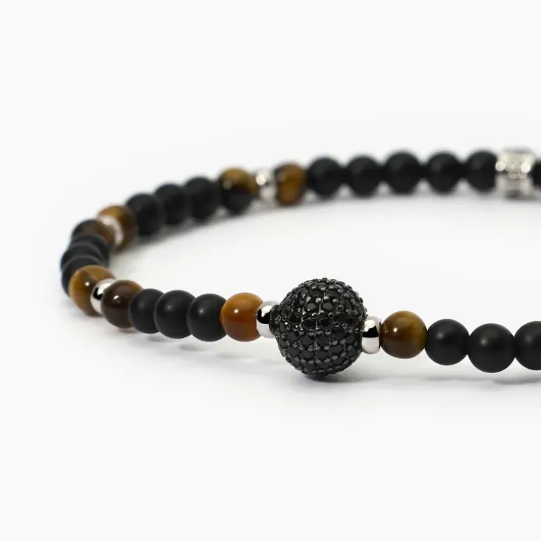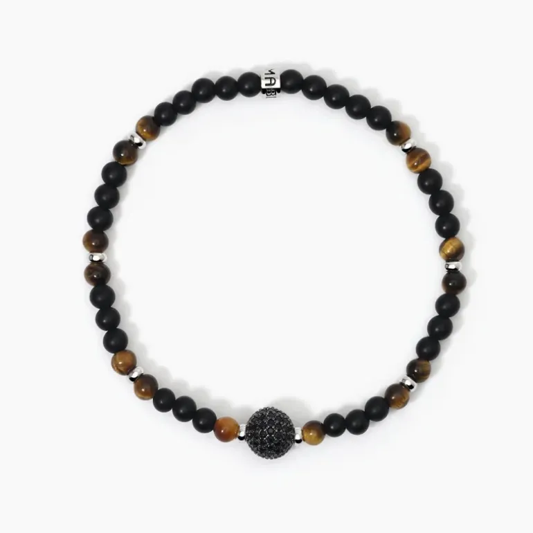 Descrizione prodotto Bracciale elastico da uomo in argento rodiato con Agata nera, occhio di tigre e sfera con zirconi neri. • Dimensioni sfera: 8,5 mm • Diametro zirconi: 1,25 mm • Diametro pietre: 4 mm • Misura unica, lunghezza 19 cm • Materiale: Argento 925, Agata nera, Occhio di tigre, Zirconi