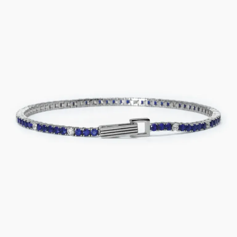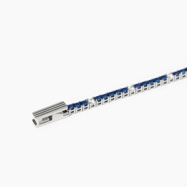 Bracciale tennis da uomo in argento rodiato con zirconi bianchi e blu. • Misura small, lunghezza 19 cm • Diametro degli zirconi: 2.50 mm • Incastonatura degli zirconi con griffe a quattro punte • Chiusura a pinza con molla con texture rigata • Materiale: Argento 925, Zirconi bianchi e blu • Finitura rodiata