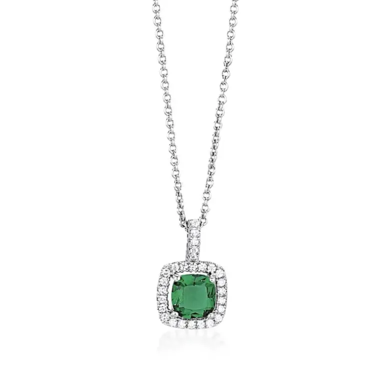 Collana in argento con ciondolo quadrato in smeraldo sintetico e zirconi. • Incastonatura delle pietre a griffe • Chiusura con moschettone • Misura regolabile, lunghezza da 40 a 45 cm • Materiale: Argento 925, Smeraldo sintetico, Zirconi
