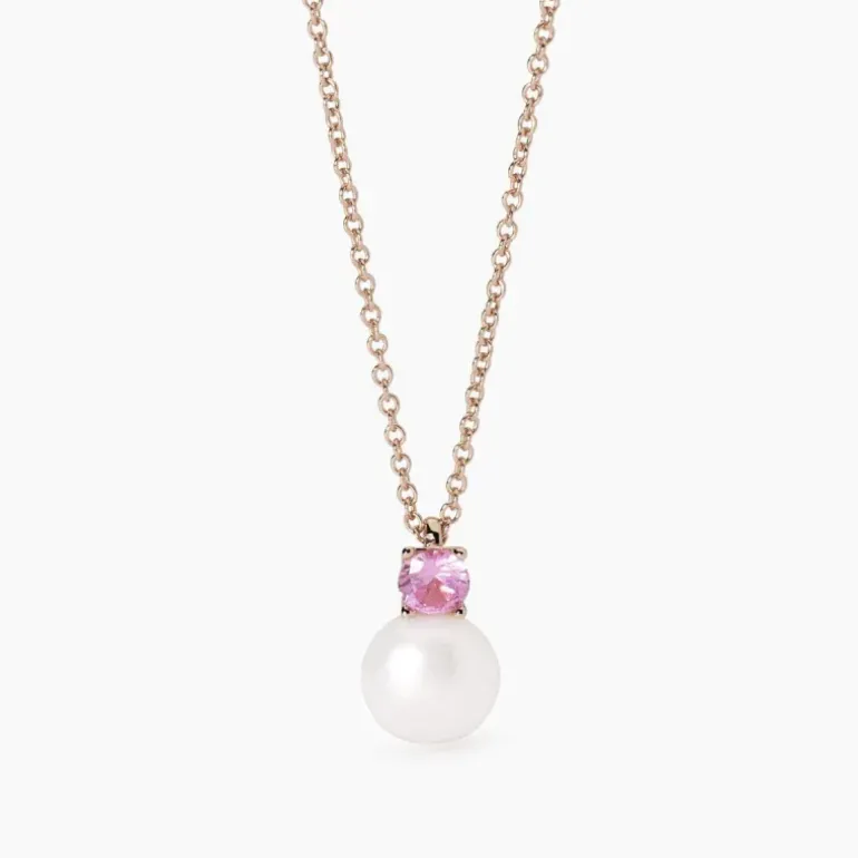 Girocollo regolabile da donna in argento placcato oro rosa 18K con catena forzatina e pendente con tormalina rosa sintetica e perla bottone coltivata. • Diametro tormalina sintetica: 5 mm • Diametro perla coltivata: 9 – 9.5 mm • Misura regolabile, lunghezza da 40 a 45 cm • Materiale: Argento 925, Acquamarina sintetica, Perla coltivata