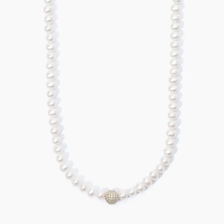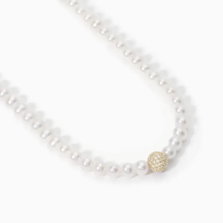 Girocollo con perle coltivate e sfera in argento dorato con pavè. • Diametro perla: 4.5 – 5 mm • Misura regolabile, lunghezza da 38 a 44 cm • Materiale: Argento 925, Perle coltivate, Zirconi bianchi