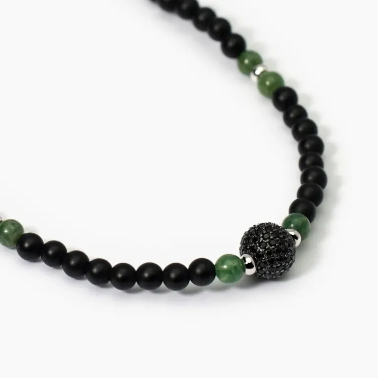 Descrizione prodotto Collana da uomo in argento rodiato con Agata nera, giada verde e sfera centrale con zirconi neri. • Diametro pietre: 4 mm • Diametro zirconi: 1,25 mm • Misura regolabile, lunghezza da 45 a 50 cm • Materiale: Argento 925, Agata nera, Giada verde, Zirconi