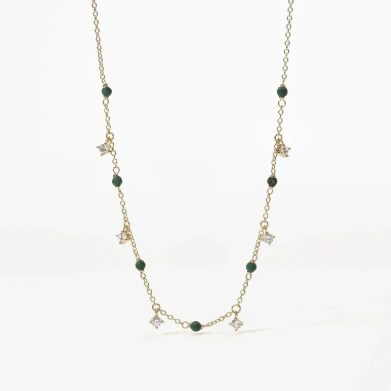 Collana in argento dorato con sfere in malachite e punti luce in zircone • Incastonatura degli zirconi a griffe • Diametro delle sfere: 3-3,5 mm • Diametro degli zirconi: 3 mm • Chiusura con moschettone • Misura regolabile, lunghezza da 36 a 40 cm • Materiale: Argento 925, Malachite, Zirconi