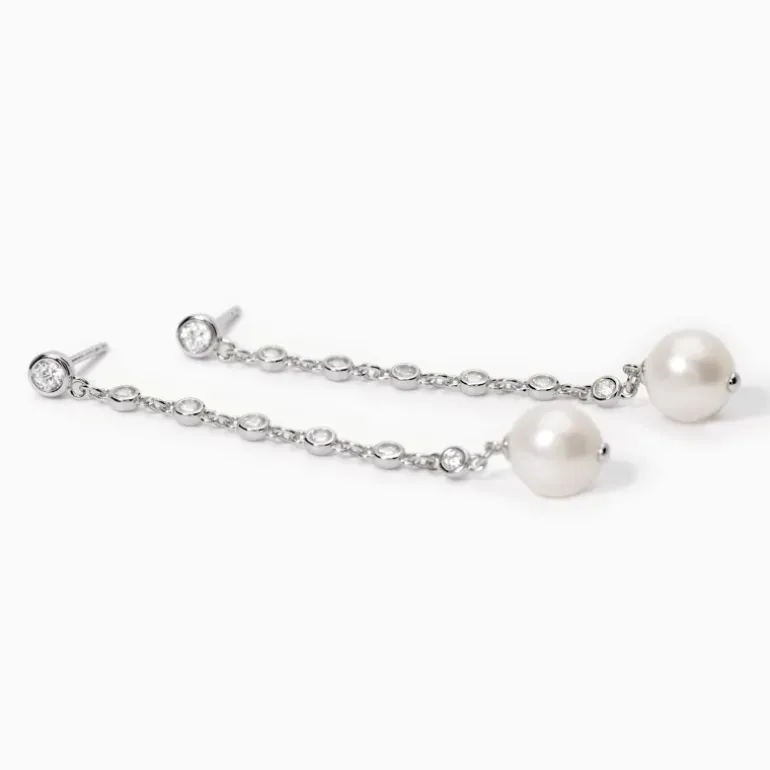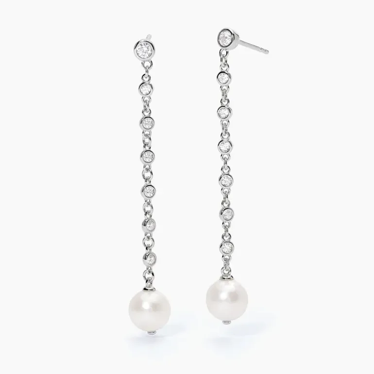 Orecchini pendenti in argento con perle coltivate e punti luce. • Diametro perle: 8.5 – 9 mm • Diametro zirconi: 2 e 3 mm • Incastonatura degli zirconi a griffe • Materiale: Argento 925, Perle coltivate, Zirconi