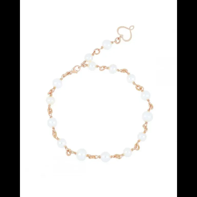 Bracciale rosario della Collezione Perla di Labuan realizzato in argento 925 con galvanica oro rosa ad alto spessore e resistenza. Il bracciale presenta perle di diversi diametri e può essere regolato fino ad un massimo di 23 cm. è presente un cuore Maman traforato. Chiusura a moschettone.