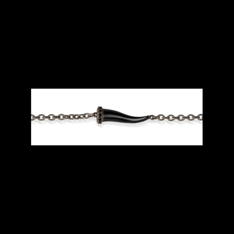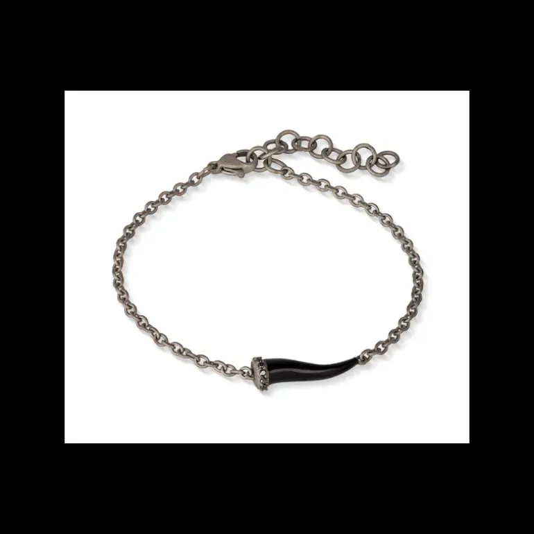 Bracciale da uomo in titanio e 5 diamanti black. Lo sviluppo del bracciale prende forma dall’elemento principale: un cornetto portafortuna in titanio smaltato colore nero. Attorno all’estremità più grande, sono incastonati 5 diamanti black per una caratura totale di 5 punti. Ai vertici del cornetto smaltato , due piccoli anellini fungono da supporto per la catena che termina con una serie di anellini permettendo così massima indossabilità per ogni polso. A garanzia del marchio MANO, sulla parte posteriore del cornetto, fa la sua comparsa il diamante black da 1 punto, simbolo inconfondibile del brand.