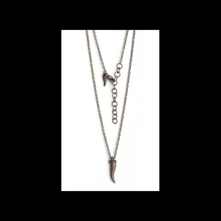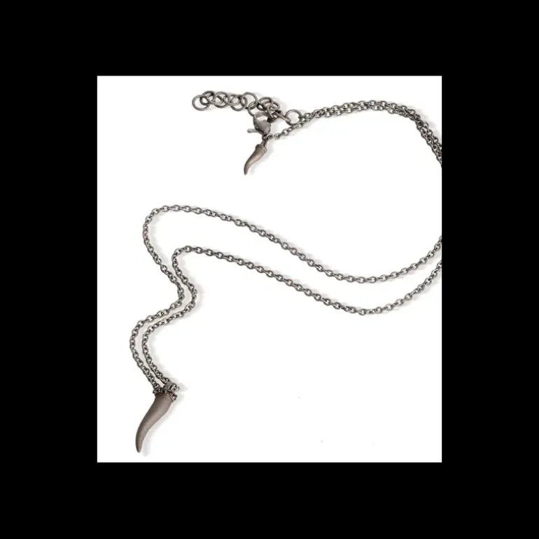 Collana da uomo in titanio e 5 diamanti black. Lo sviluppo della collana prende forma dall’elemento principale: un cornetto portafortuna in titanio. Attorno all’estremità più grande, sono incastonati 5 diamanti black per una caratura totale di 5 punti. Al vertice superiore del cornetto, un piccolo anellino funge da supporto per la catena che termina con un doppio anellino permettendo così di accorciare o allungare la collana, donando massima indossabilità.A garanzia del marchio MANO|J., sulla parte posteriore del cornetto, fa la sua comparsa il diamante black da 1 punto, simbolo inconfondibile del brand.
