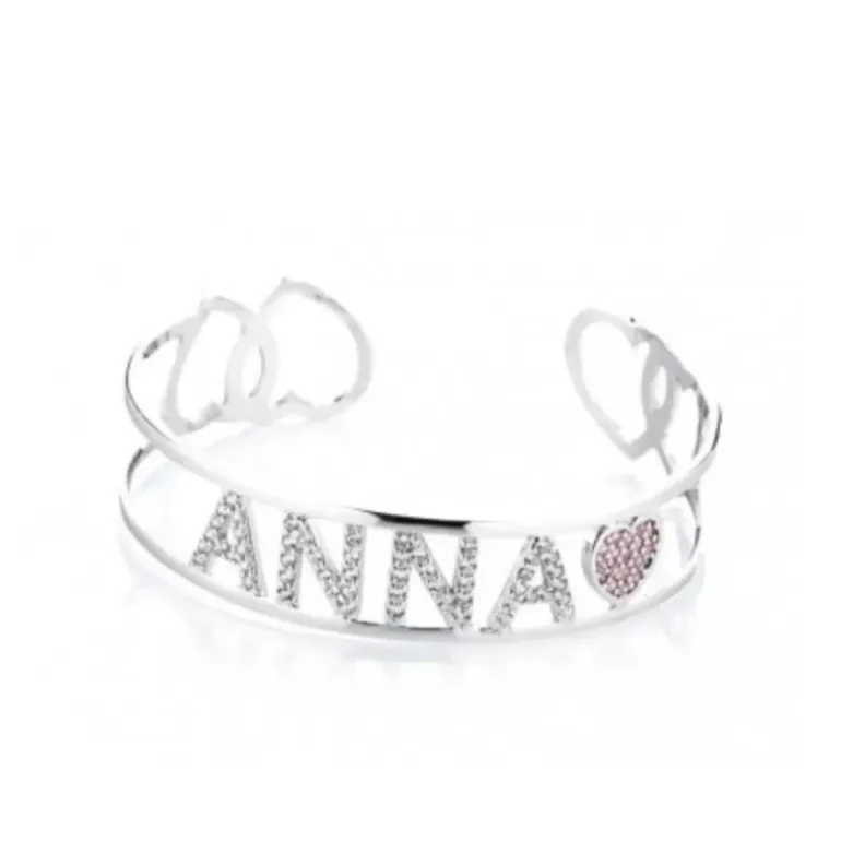 Rigido bracciale aperto personalizzabile col proprio nome. Elegante e luccicoso, questo gioiello é un must per ogni donna ed un regalo perfetto per una donna importante.