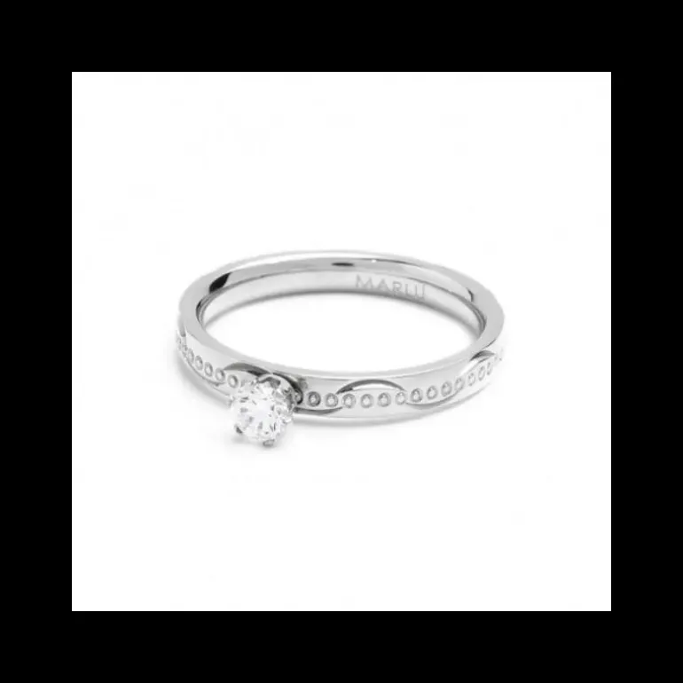 Anello in acciaio con cristallo bianco di 4 mm al centro e texture a cerchietti incisi. Logo Marlù e taglia laserati all’interno. Altezza anello 3,10mm Materiali: acciaio Collezione: VSN08