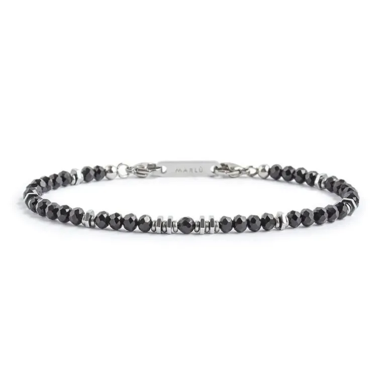 Bracciale in acciaio con catena box, con alternati elementi di agata nera, ematite ed acciaio. Lunghezza totale 21 cm, regolabile da 21 a 19 cm tramite logo tag Marlù in acciaio removibile. Materiali: acciaio, agata, ematite Collezione: MAN06