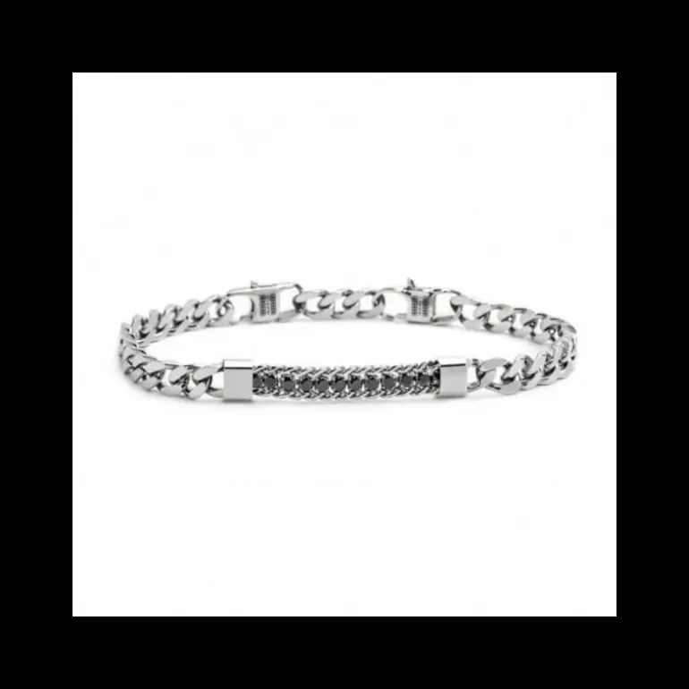 Bracciale in acciaio con catena a grumetta con spessore 5,9 mm, con centrale a triplo filo con catena tennis con zirconi neri e con catena grumetta sui lati. Lunghezza totale 21 cm, regolabile da 21 a 19,5 cm tramite catena grumetta removibile. Materiali: acciaio, zirconi