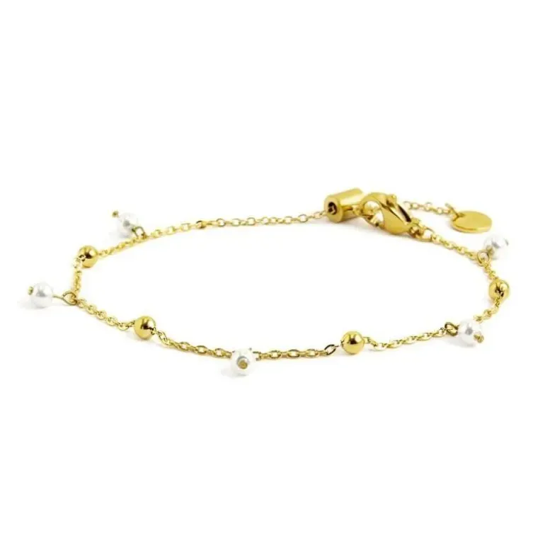 Bracciale in acciaio con pvd oro con catena con sfere in acciaio alternate a perle pendenti con diametro 3.30 mm. Lunghezza totale 19 cm regolabile da 19 cm a 14 cm tramite cursore. Marlù logo tag presente all’estremità. Materiali: acciaio con pvd oro