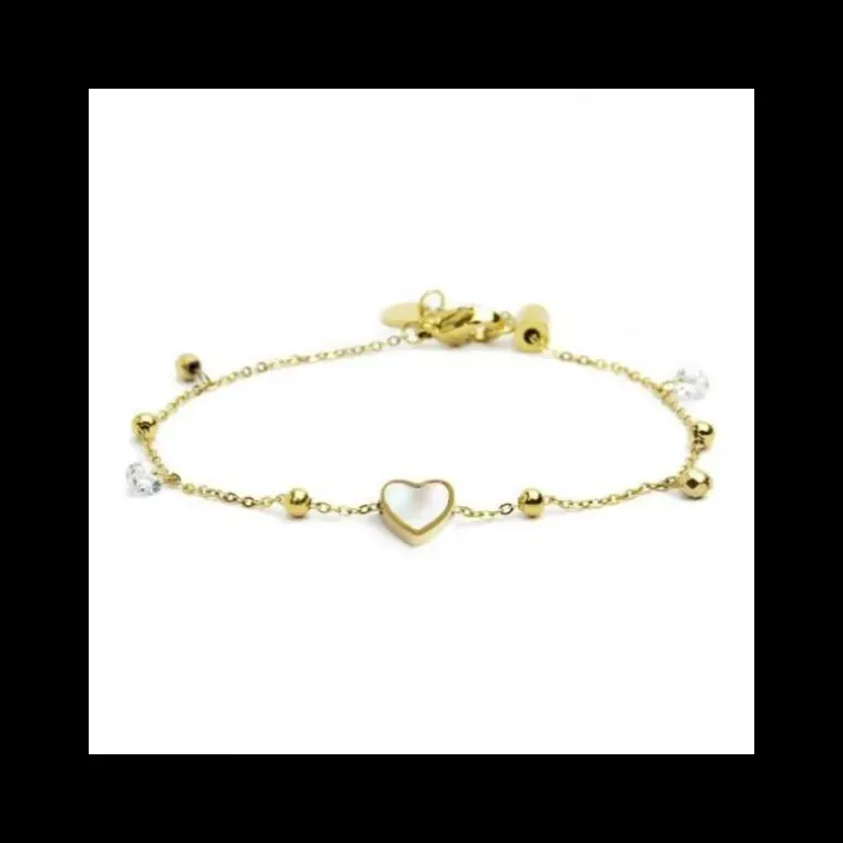 Bracciale in acciaio con pvd oro con catena con sfere di acciaio. Lungo la catena sfere pendenti alternate in ematite e cristalli. Al centro è presente un cuore in acciaio con superficie frontale in madre perla, sul retro raggi incisi che formano un cuore. Lunghezza totale 19 cm regolabile