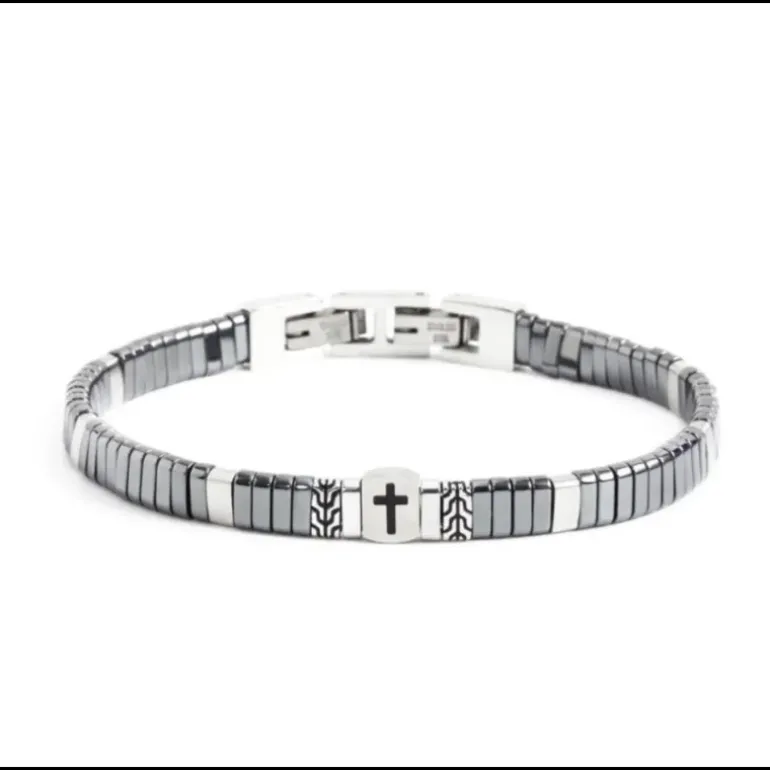 Bracciale con catena con elementi in ematite color antracite, ematite satinata, acciaio satinato, acciaio lucido. L’elemento centrale ha al suo centro una croce incisa con smalto nero. Lunghezza regolabile 19/21cm