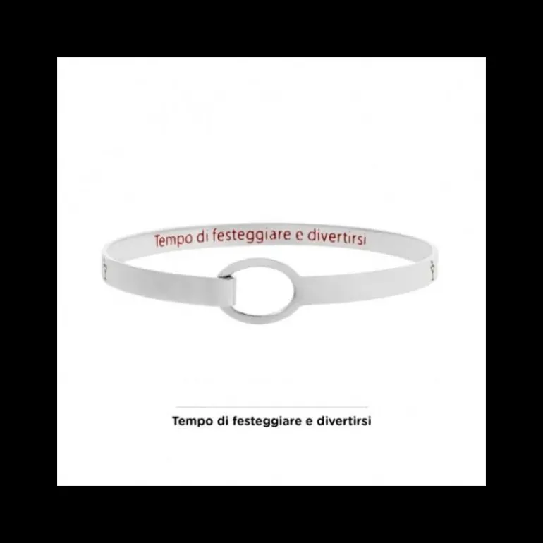 Bracciale con incisione #Time To PARTY and have fun. Diametro cm 6. Collezione Time To. Materiali: acciaio, smalto