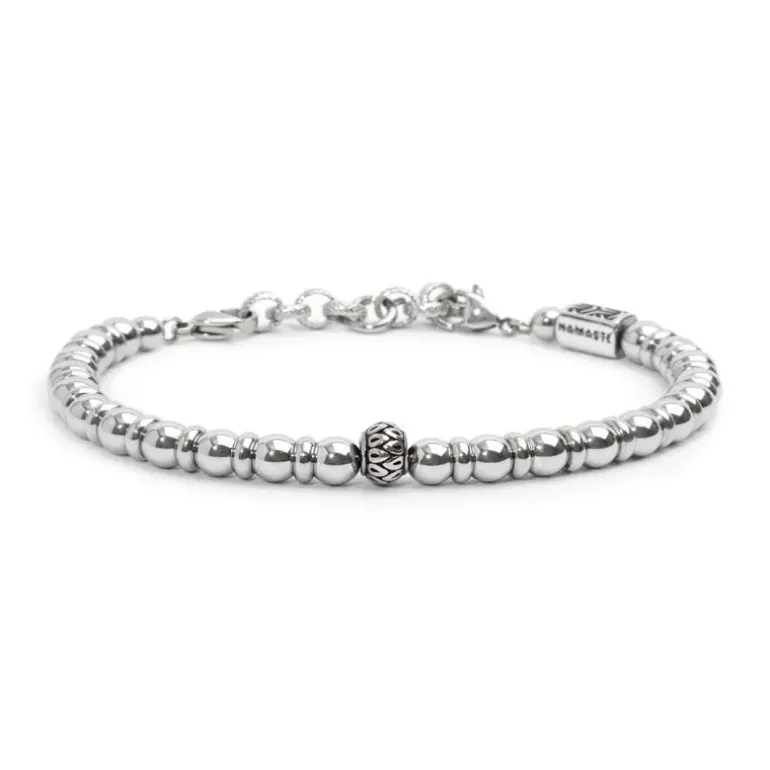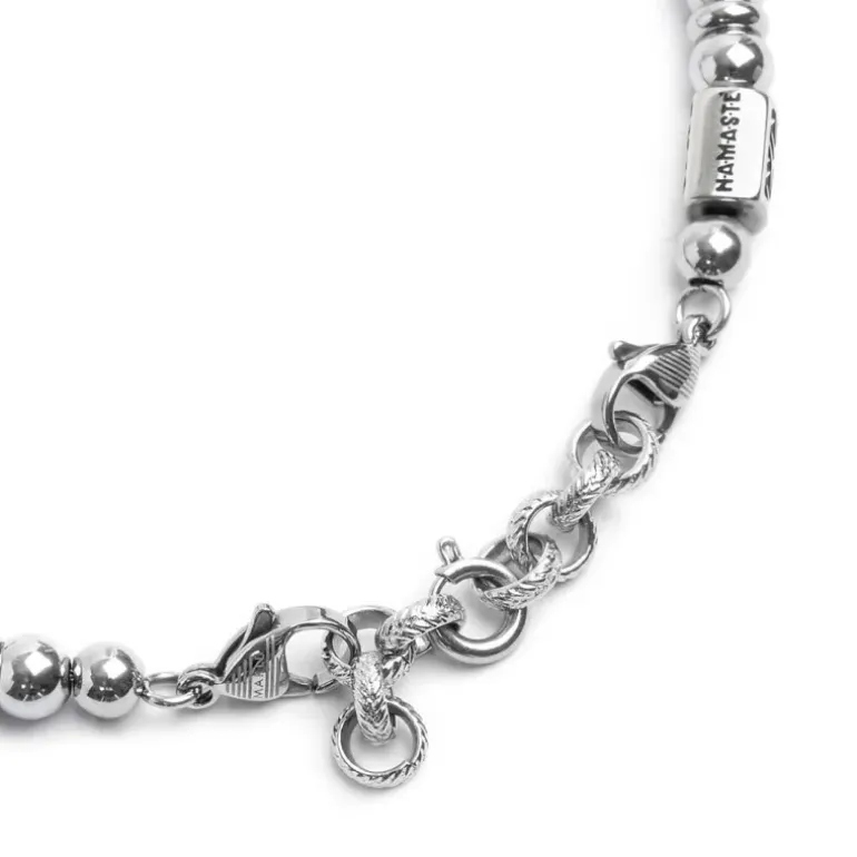Bracciale in acciaio con sfere di ematite alternate a dischetti di acciaio, elemento centrale a forma cilindrica in acciaio con trama con black oil. Ad una estremità elemento rettangolare in acciaio con trama con black oil, sul fronte il logo Marlù, su retro la parola Namastè. Chiusura con moschettone su entrambi i lati. Estensione con catena rolò con trama, removibile e/o regolabile tramite moschettone tondo al centro. Materiali: acciaio, ematite, black oil