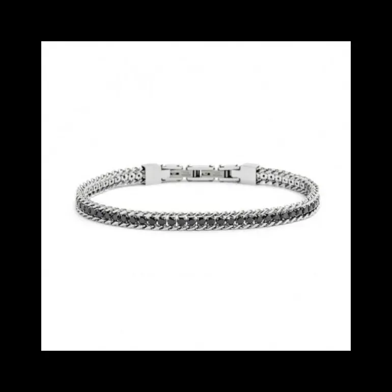 Bracciale tennis con spessore 2,50 mm con cristalli neri nella parte centrale e con catena grumetta sui lati.Taglia M: Lunghezza 18cm regolabile da 18cm a 17cm Taglia L: Lunghezza 21cm regolabile da 21cm a 20cm