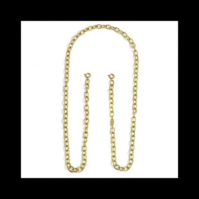 Queste catene sono studiate appositamente per tenere al collo ogni tipo di occhiale e mascherina. I moschettoni si aprono per permetterti di cambiare ogni volta che vorrai ed è semplice infilarle e sfilarle dalla testa senza doverle aprire ogni volta. Puoi utilizzare la catena anche come collana unendo i moschettoni. Catena porta occhiali in acciaio con pvd oro con catena “O” con spessore 5,60 mm. Lunghezza totale 70 cm Collezione: ACCESSORI01 Materiali: acciaio con pvd oro