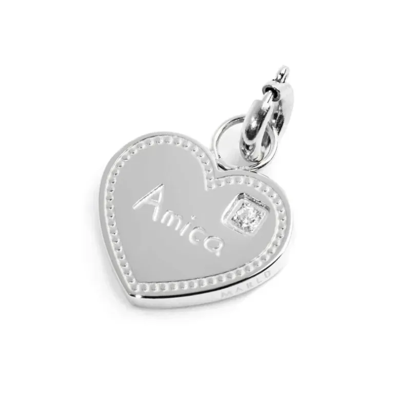 Charm a forma di cuore con misura 1*1,2 cm, con al centro incisa la scritta “Amica” e cubic zirconia bianco. Sul retro incisa la scritta “Per dirti che sei nel mio” con un cuoricino con smalto rosso. Logo Marlù laserato sul bordo