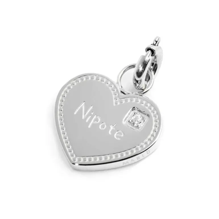 Charm forma di cuore con misura 1*1,2 cm, con al centro incisa la scritta “Nipote” e cubic zirconia bianco. Sul retro incisa la scritta “Per dirti che sei nel mio” con un cuoricino con smalto rosso. Logo Marlù laserato sul bordo.