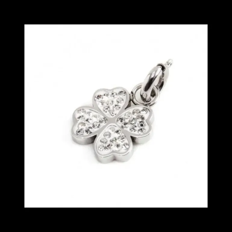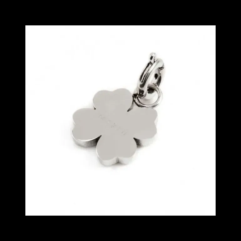Charm in acciaio a forma di quadrifoglio. Sul fronte il quadrifoglio ha strass bianchi, sul retro è presente il logo MARLU’ laserato.
