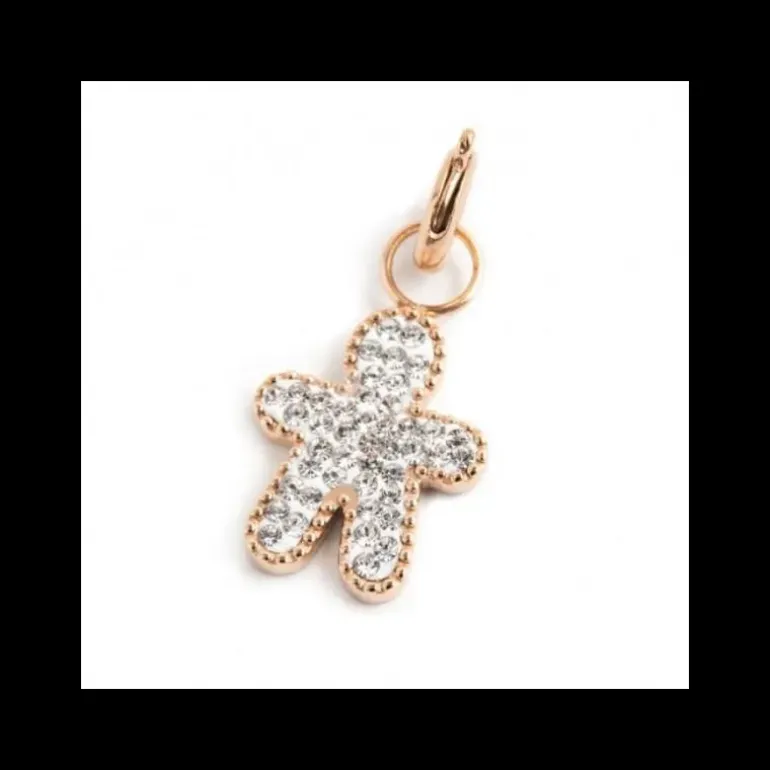 Charm in acciaio rosè pvd a forma di bimbo, nella parte anteriore sono presenti cristalli bianchi. Sul retro è inciso al laser la scritta “Nel mio cuore”, un cuore e il logo Marlù. Diametro charm 12mm Collezione: Nel Mio Cuore 24 Materiali: acciaio con pvd rosè, cristalli