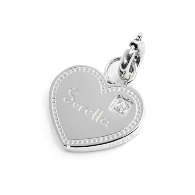 Charm a forma di cuore con misura 1*1,2 cm, con al centro incisa la scritta “Sorella” e cubic zirconia bianco. Sul retro incisa la scritta “Per dirti che sei nel mio” con un cuoricino con smalto rosso. Logo Marlù laserato sul bordo