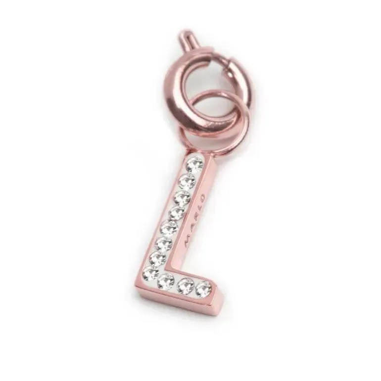 Charm in acciaio lettera sagomata con cristalli bianchi. Sul retro texture con puntini in rilievo. Logo Marlù laserato su un lato.