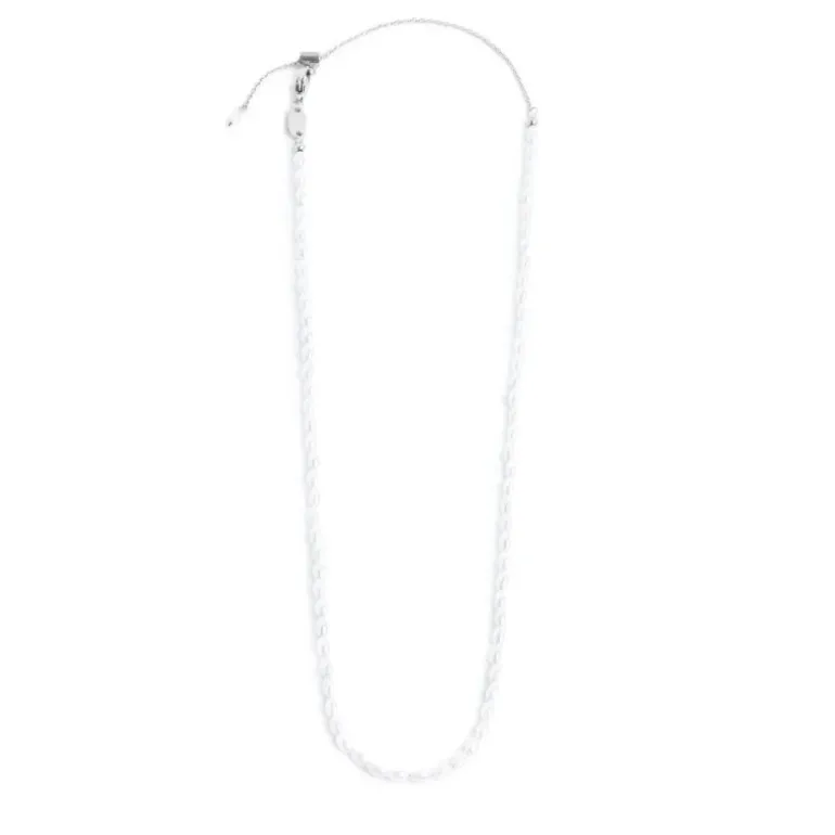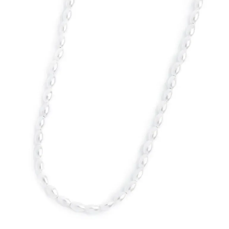 Collana in acciaio con catena con perle ovali bianche rivestite 0,30×0,50 mm. Tag ovale con il logo Marlù ad una estremità vicino al moschettone. All’altra estremità una perla ovale bianca rivestita. Lunghezza totale 50 cm regolabile tramite cursore da 50 a 40 cm. Materiali: acciaio, perle rivestite