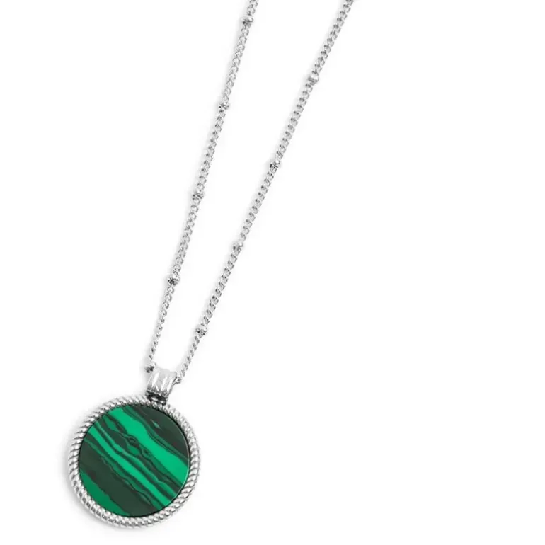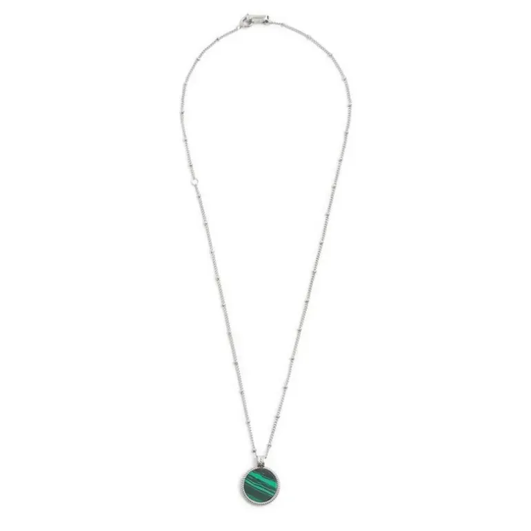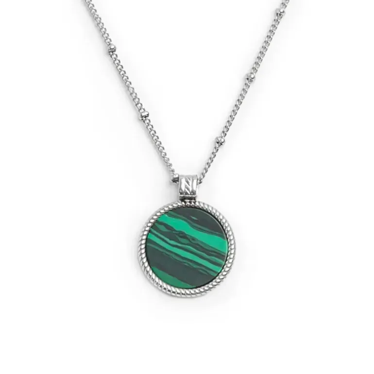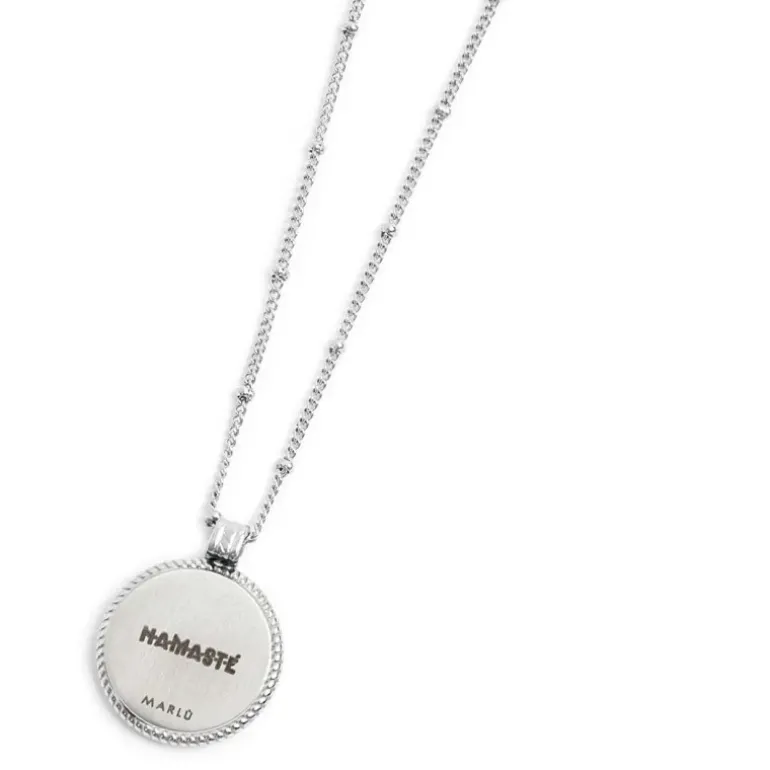 Collana in acciaio con catena a grumetta con sfere, con pendente con piastrina tonda con pietra diametro 1,7 cm. Logo Marlù e scritta Namastè incisi sul retro. Lunghezza totale 50 cm, regolabile da 50 cm a 45 cm. Materiali: acciaio, pietra
