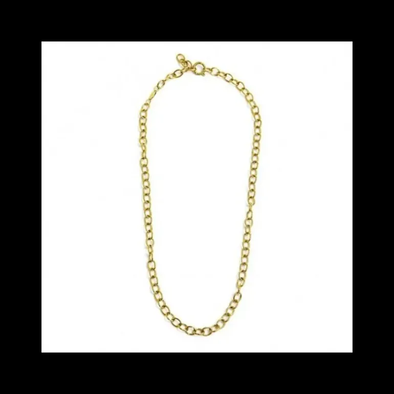 Collana in acciaio con pvd oro con catena “O” con larghezza 5,60 mm e 1,20 di spessore. Lunghezza totale 50,2 cm. Marlù logo tag ovale presente all’interno della catena. Collezione: BEW09 Materiali: acciaio con pvd oro