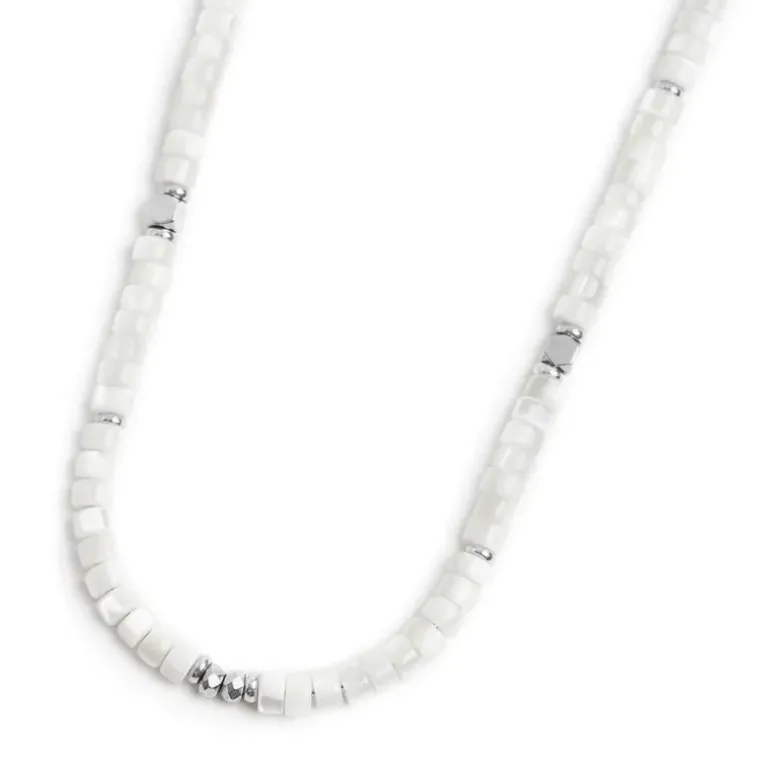 Collana in acciaio con pietre. Lunghezza totale 50 cm, regolabile da 50 a 40 cm tramite cursore. Marlù logo tag presente all’estremità. Materiali: acciaio, pietre, ematite Collana con rondelle bianche: rondelle in madreperla diam. 4 mm alternate da anelli in acciaio