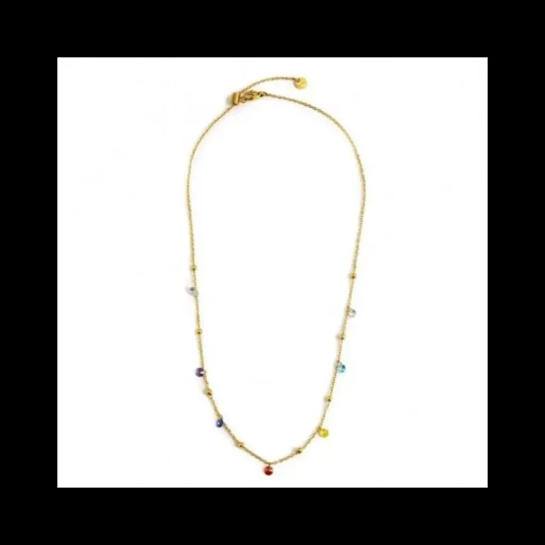 Collana in acciaio con pvd oro con catena “O” e catena market ball, con cristalli colorati e sfere di acciaio alternati. Lunghezza totale 45 cm regolabile tramite cursore cilindrico con anello con silicone. Marlù logo tag presente all’estremità. Col