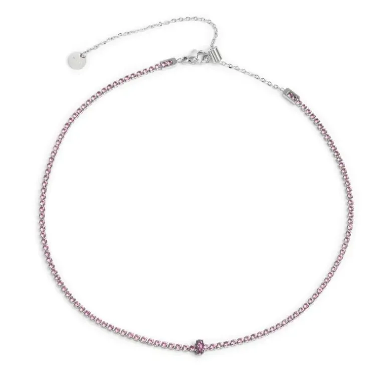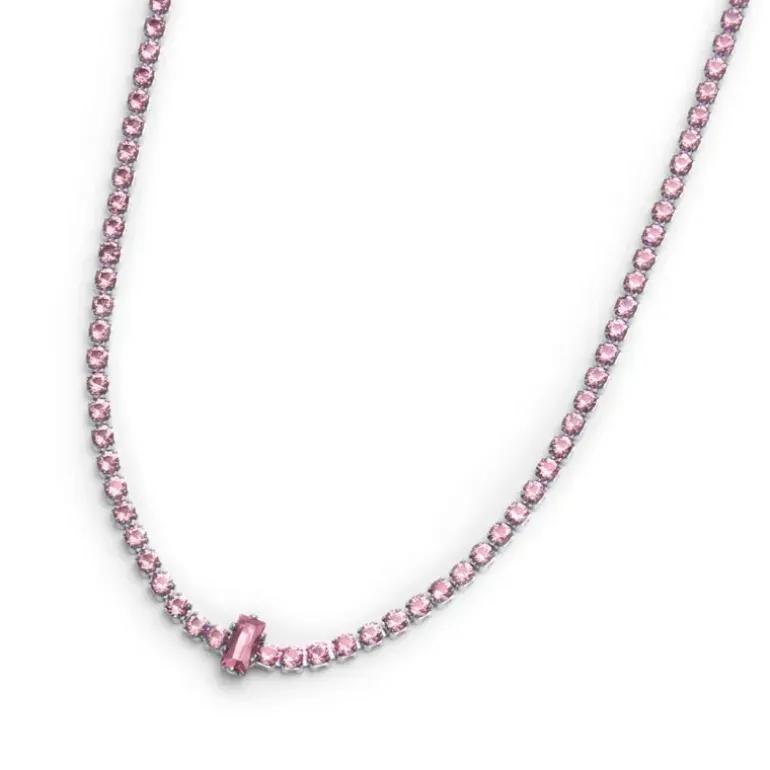 Collana choker con catena tennis con cubic zirconia, con al centro cubic zirconia taglio baguette. Zirconi di diametro 2 mm con al centro uno zircone a taglio baguette disposto verticalmente tono su tono nelle colorazioni verde smeraldo, rosa e viola ametista. Lunghezza totale 42 cm regolabile tramite cursore da 42 cm a 32 cm. Chiusura a moschettone. Marlù logo tag presente all’ estremità.
