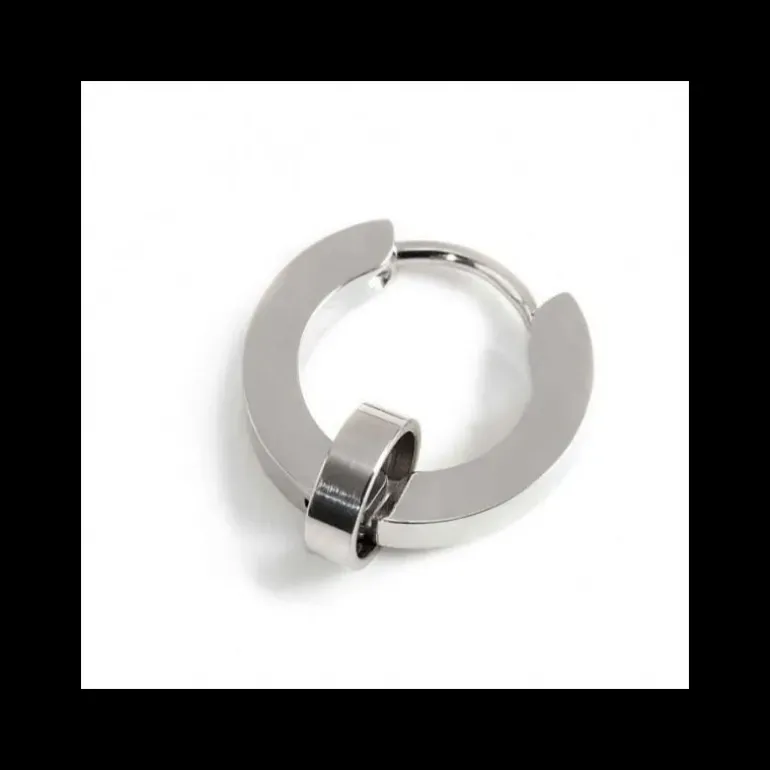Mono orecchino cerchio in acciaio con diametro di 14 mm, con spessore 2.30 mm, con anello removibile per charm, la chiusura è a pressione. Il logo Marlù è presente sul lato.