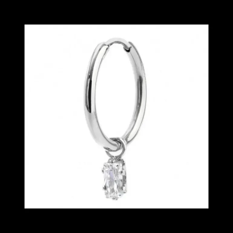 Mono orecchino in acciaio a cerchio con diametro 15,30 mm con chiusura a pressione, con cristallo baguette bianco pendente. Logo Marlù laserato sul fianco. Materiali: acciaio, cristallo Collezione: BEW12