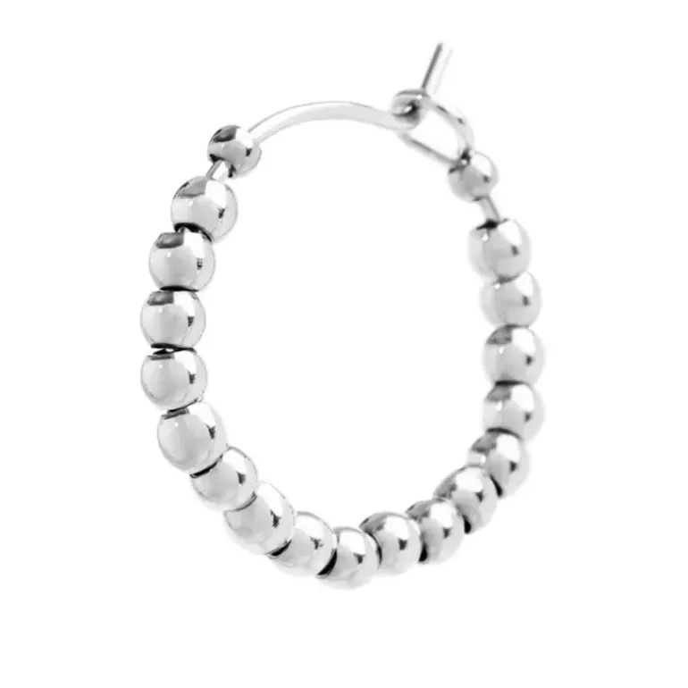 Mono orecchino a cerchio con diametro 1,7 cm con sfere, ad un’estremità una sfera con presente il logo Marlù.